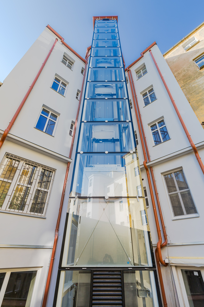 The entire apartment building underwent extensive renovation, which included a new chip access system, audio phones, new entrance doors, mailboxes, painting, lighting, and the construction of cellar cubicles. The house has a new glass elevator attached to the facade of the house.
