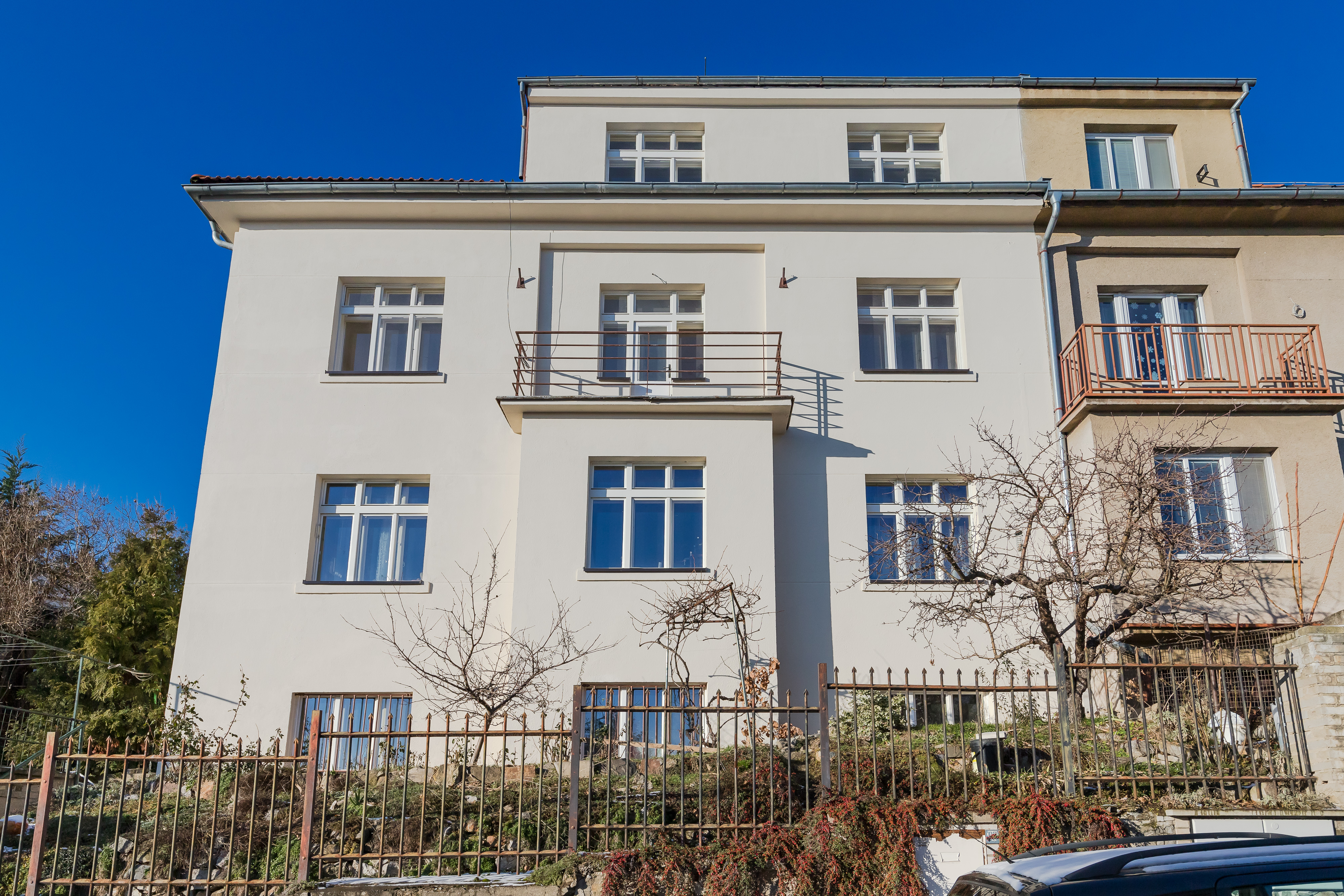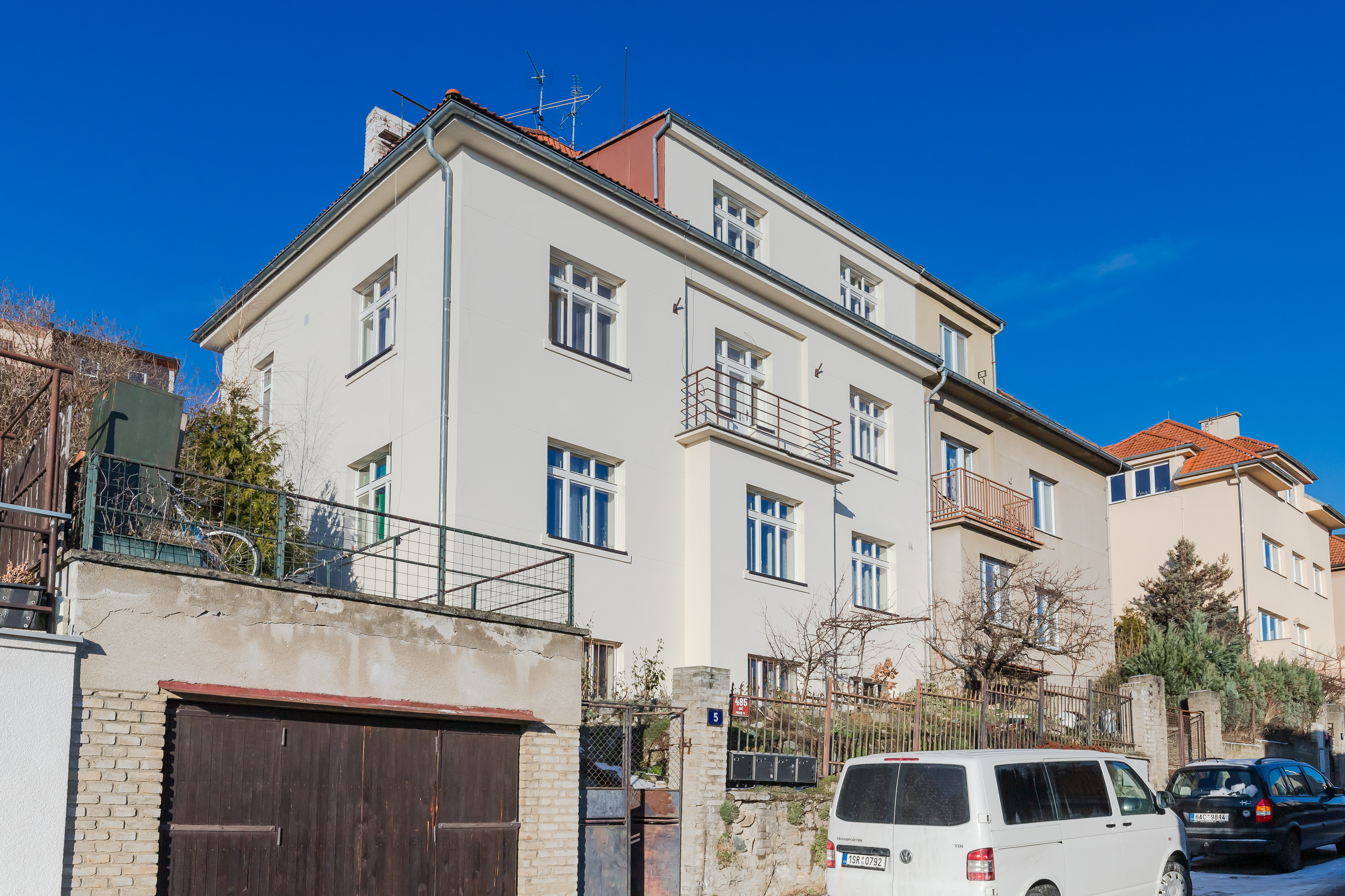 Vila dům je po kompletní rekonstrukci, jsou opravené společné prostory, nová fasáda a obě bytové jednotky jsou připravené k okamžitému nastěhování. Byt v nejvyšším podlaží nabízí úžasné výhledy na Prahu. Možnost využití zahrady představuje velký benefit pro vysoký standard bydlení v Praze.